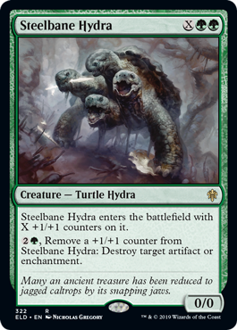 Steelbane Hydra – This Brawl deck exclusive card could be the threat green needs to have some repeatable enchantment removal. Thrashing Brontodon can deal with 1, but this can deal with multiple enchantments.