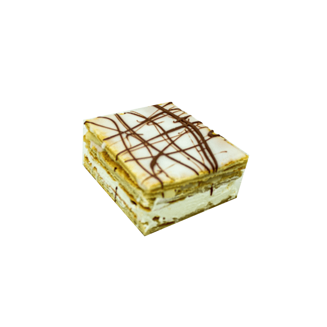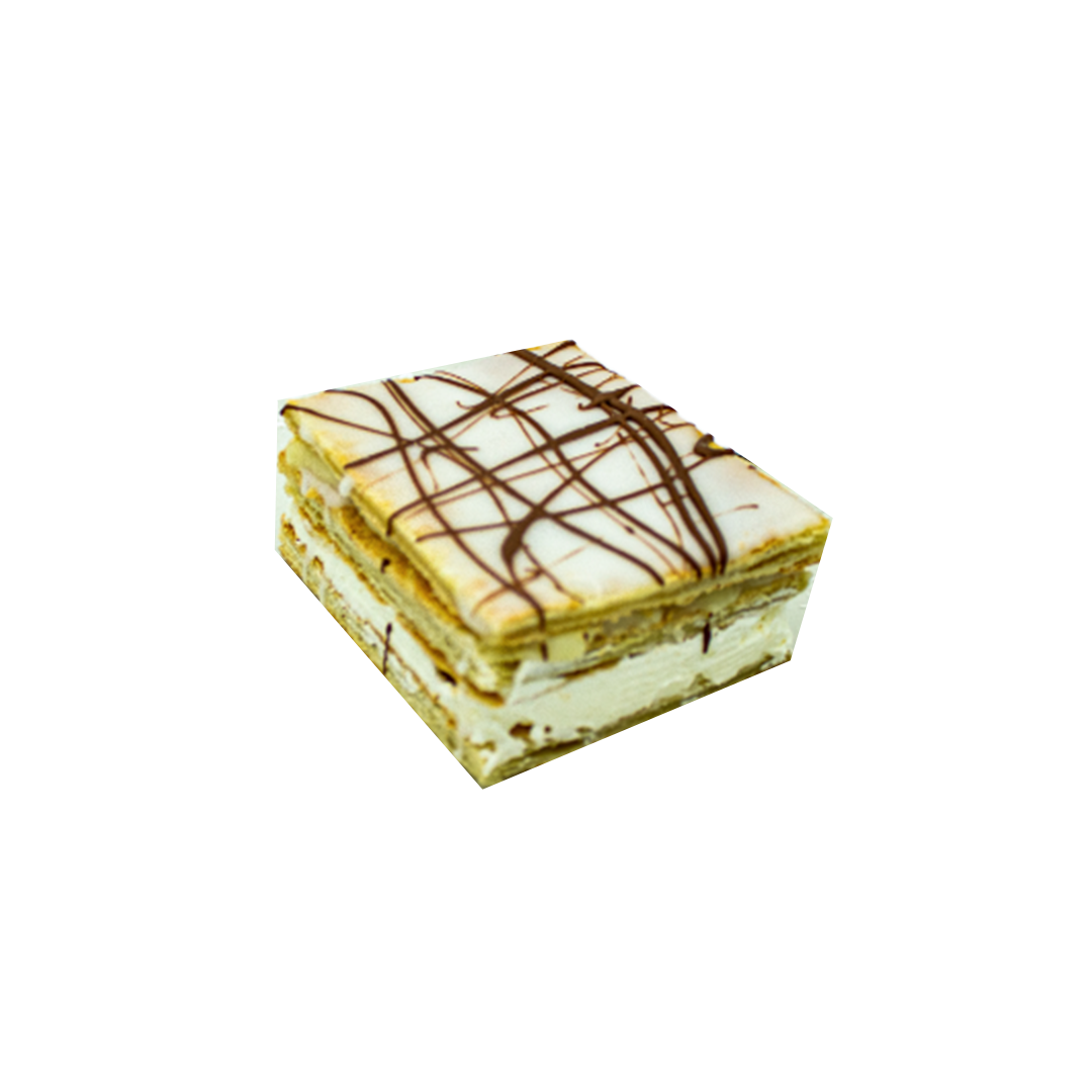 A decadent mille-feuille, layers of puff pastry, a layer of custard, a layer of whipped cream, topped with a sugar icing and a drizzle of chocolate. Served fresh on weekends.